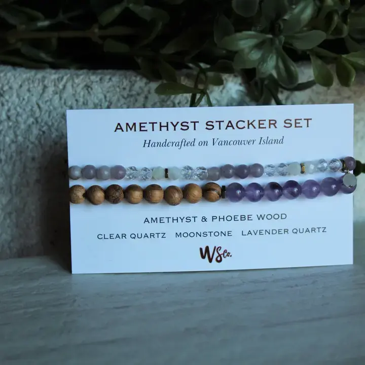 Handcrafted on Vancouver Island, this unique set of stacker bracelets is both stunning and versatile! Hand beaded with love on a strong and durable elastic cord. * Larger stacker bracelet features Phoebe Wood and Amethyst gemstones, with Pyrite accents. Amethyst is known to soothe the mind and emotional body, helping to relieve stress and mental anxieties. Initiating deeper understanding, this piece can help identify the root causes of negative behaviors and patterns. * Delicate stacker bracelet incorporates Clear Quartz, Moonstone, and Lavender Quartz gemstones. Finished with Pyrite accents and a hand wire-wrapped gemstone dangle. Moonstone helps to balance emotions, creating inner stability and calmness.