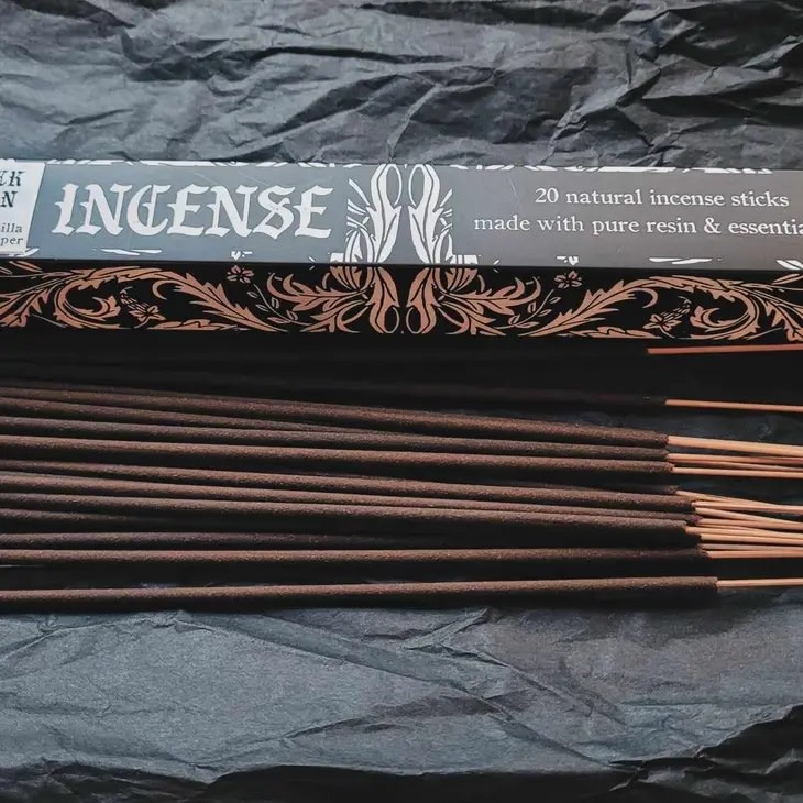 Triple scented, all natural incense made with grounding resins and energizing essential oils. Featuring our beloved (most popular!) Black Moon blend of citrus, vanilla and black pepper. Produces a gentle, all natural, high quality smoke, free of synthetic ingredients. 20 sticks per box. To Use: Place stick in a fireproof vessel, light tip, allow it to burn for a bit then gently blow out and enjoy. Never leave burning incense unattended. 20 sticks per package