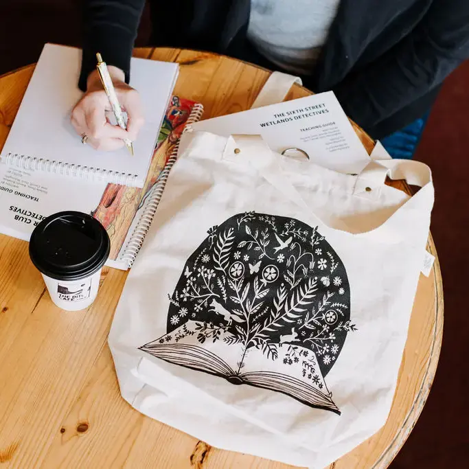 Handles sturdy reinforced cotton webbing, perfect for shopping! Inside pocket and key chain holder Wide bottom gusset so it can stand up Size :13.5"x 15" Machine wash hang dry Designed in Canada
