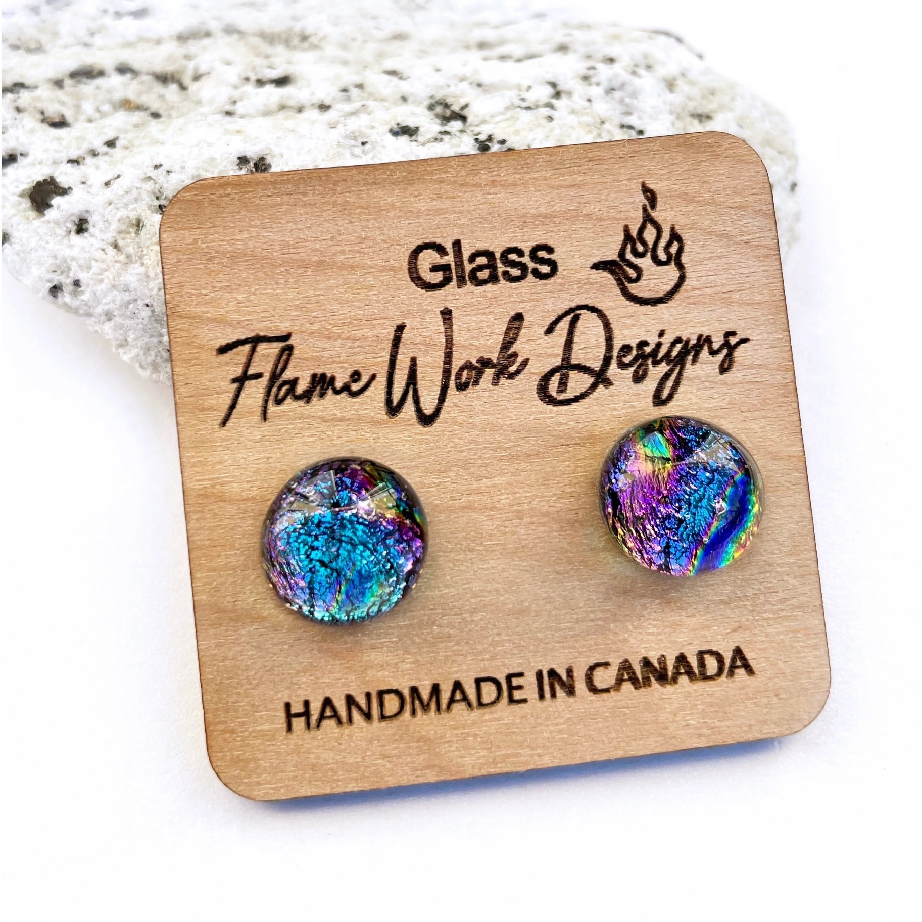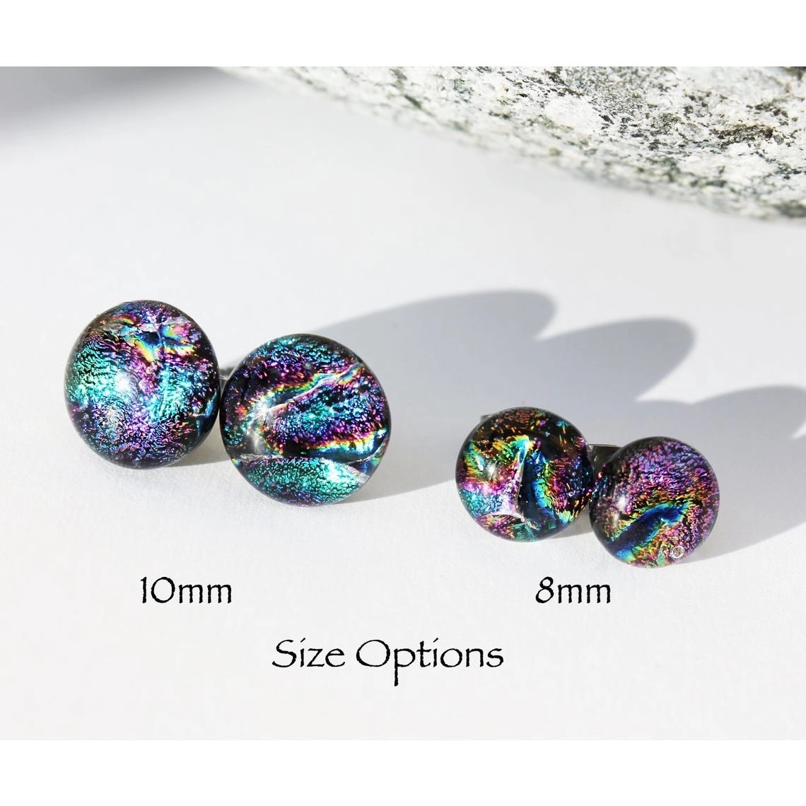 These unique Sea Foam Green Dichroic Glass Studs have been carefully handcrafted by the skillful artists Carolyn & Anthony Green, who live in Victoria, BC. Canada. Each piece of artwork is designed and fashioned from start to finish using only the finest skills in glass craftsmanship.