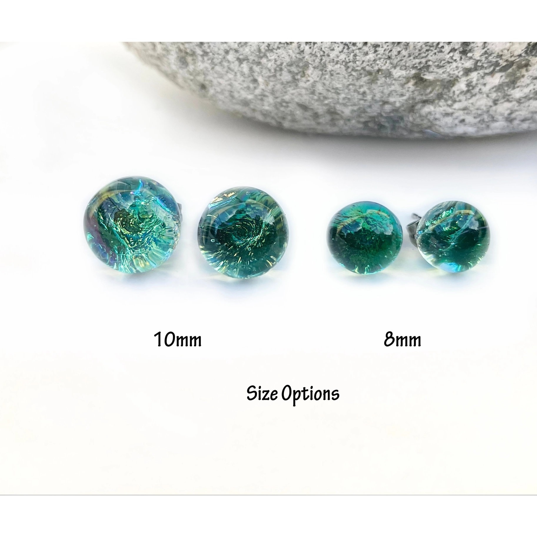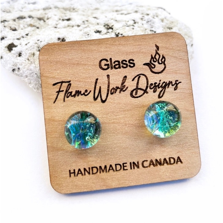 These unique Sea Foam Green Dichroic Glass Studs have been carefully handcrafted by the skillful artists Carolyn & Anthony Green, who live in Victoria, BC. Canada. Each piece of artwork is designed and fashioned from start to finish using only the finest skills in glass craftsmanship.