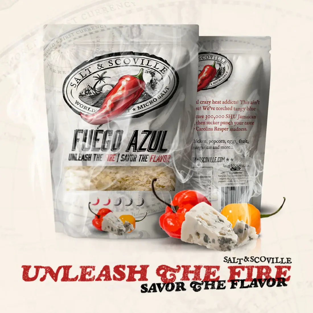 Torched & Tangy Blue Cheese micro salt perfection blended with our signature Caribbean Scotch Bonnet micro salt’s slow burnin’ flavor inferno… topped off with a fiery hot Carolina Reaper sucker punch your taste buds won’t soon forget!