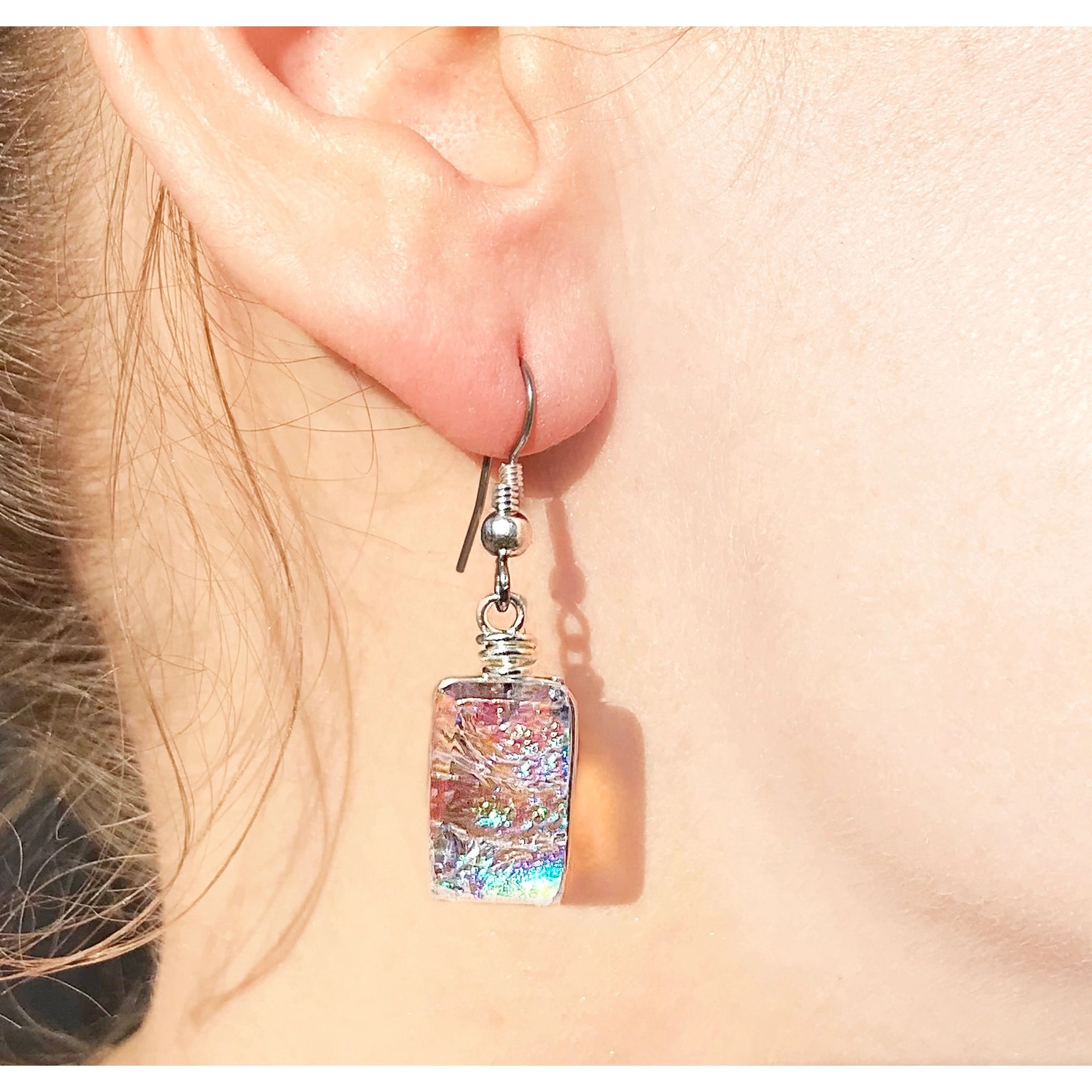 Rainbow Clear Dichroic Glass Earrings. Your eye-catching earrings will come on a personally designed wooden card. When you're not wearing them, this is the perfect place to store, so that you don't have one go missing!