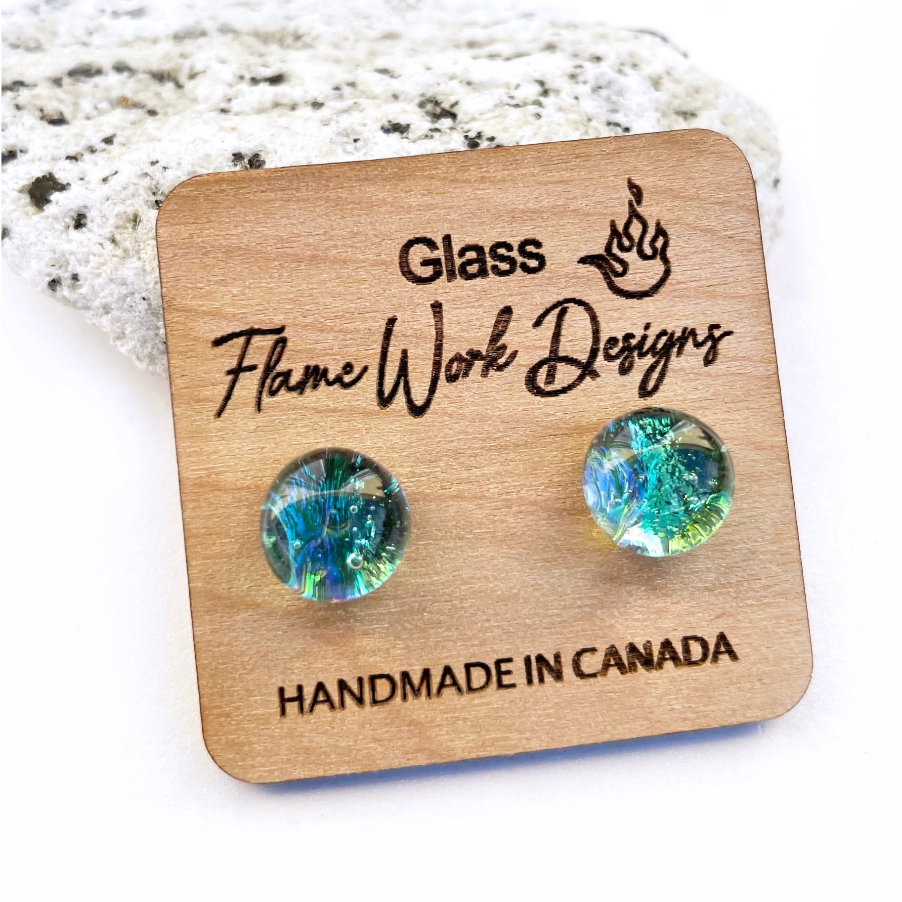 Sea Foam Green Dichroic Glass Studs 9mm. Your eye-catching earrings will come on a personally designed wooden card. When you're not wearing them, this is the perfect place to store, so that you don't have one go missing!