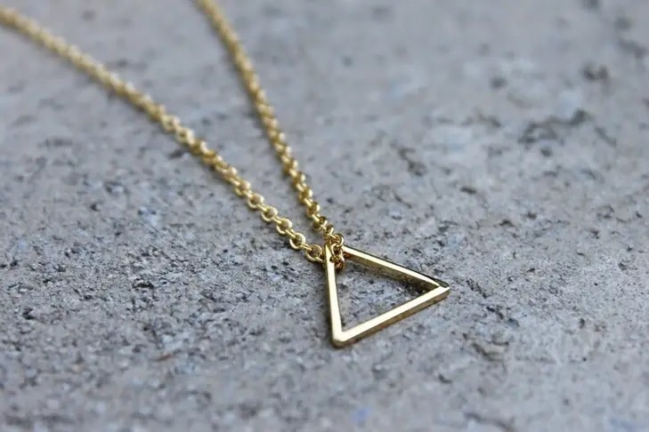 The pendant and chain are made from 16K gold plated brass. The triangle measures half of an inch (14mm) and comes on a 16” chain with 2” extender. All parts are nickel and lead free. Avoid getting wet. *Updated premium gold filled spring clasp.
