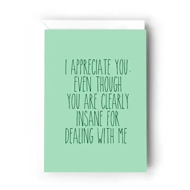Recent articlesView productCreativien StudioI Appreciate You. Even Though You Are Clearly Insane For Dealing with Me CardC$6.99