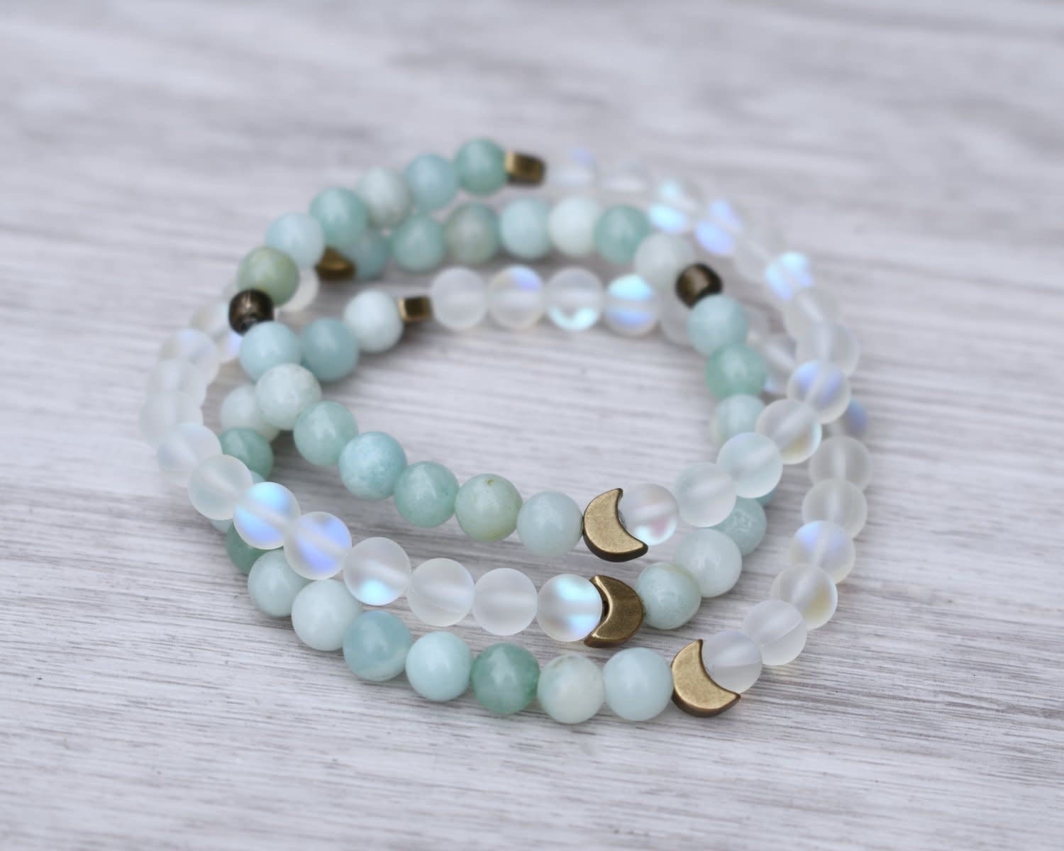 Amazonite & Mermaid Glass Bracelet made with 6mm beads and brass moon spacer beads