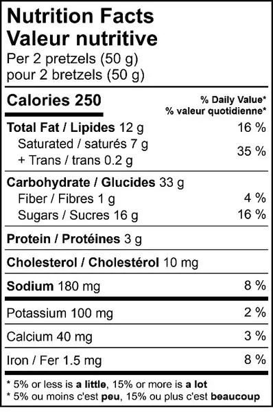 MILK CHOCOLATE (SUGAR, COCOA BUTTER, BELGIAN UNSWEETENED CHOCOLATE, WHOLE MILK POWDER, SKIM MILK POWDER, MILK FAT, LECITHIN "SOY", VANILLA EXTRACT), PRETZEL (ENRICHED WHEAT FLOUR, WATER, CANOLA OIL, SALT, MALT, YEAST, SODA), TOFFEE (SUGAR, BUTTER, ALMONDS (ROASTED IN COCOA BUTTER AND/OR SUNFLOWER OIL), LACTOSE, SALT, ARTIFICIAL FLAVORS). MAY CONTAIN PEANUTS AND EGGS. MADE IN CANADA WITH IMPORTED INGREDIENTS.