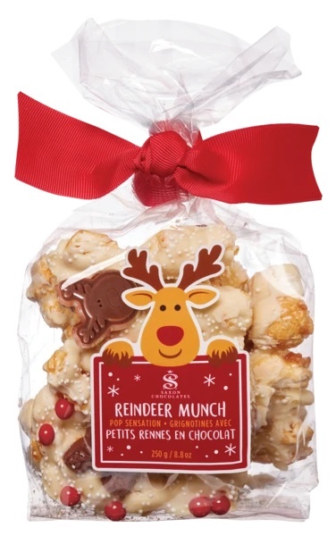 Delight in our amazing Reindeer Munch, caramel corn drizzled with white chocolate topped with cute mini solid milk chocolate reindeer pieces and reindeer noses made with milk & red chocolate pretzel balls