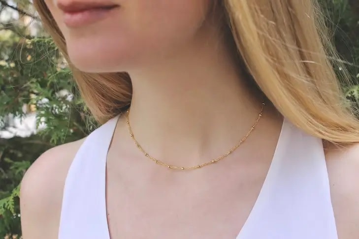 A thin 16k gold plated brass chain makes a simple but elegant statement. The chain measures 15” and comes with a 2” extender. Avoid getting wet. *Updated premium gold filled spring clasp.