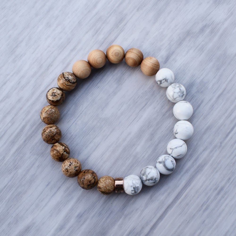 Gemstone Stacking Bracelet made with Picture Jasper, White Howlite & Cedar Wood
